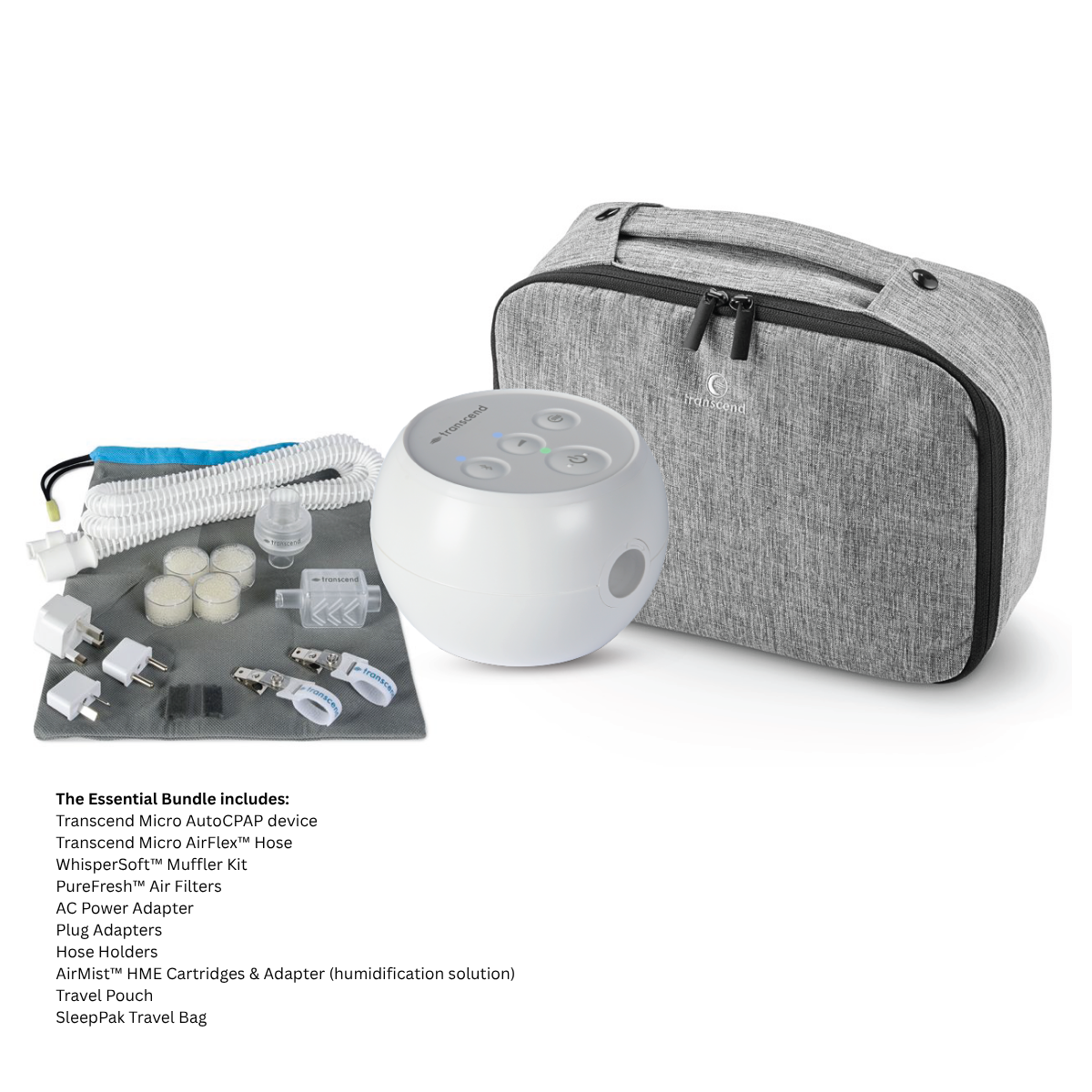 The Essential Bundle is ideal for travelers who need a complete, reliable setup for use with standard wall outlets or bedside power. It includes the Transcend Micro Auto CPAP machine along with all the must-have accessories to ensure smooth and comfortable therapy on the go.